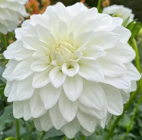 The dahlia ‘Bahia Blanca’ is a decorative-type dahlia with elegant, fully double white blooms lightly touched with cream at the center. The blooms are small to medium in size, well-double, and classified as decorative or formal decorative, meaning the petals are broad, regular, and neatly arranged to form a rounded flower. The petals are pure white with a subtle creamy tint toward the heart of the flower, giving it a soft, refined look rather than stark white. ‘Bahia Blanca’ forms a clump of stems arising from tuberous roots, typical of dahlias. It produces strong, tall stems that hold the flowers upright, making it suitable for cutting and for the middle or back of borders. The foliage is the usual deep to mid-green dahlia foliage, which sets off the white flowers clearly.